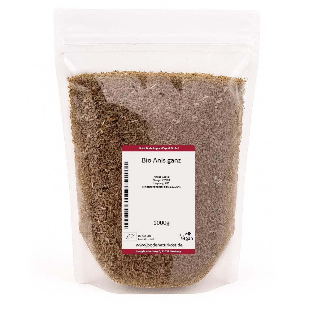 Gehele anijszaden. De schermbloemige plant komt oorspronkelijk uit Azië en de zuidoostelijke Middellandse Zeelanden. De lichtgele tot groenbruine zaden smaken zoetig en licht naar drop. Ze zijn in veel