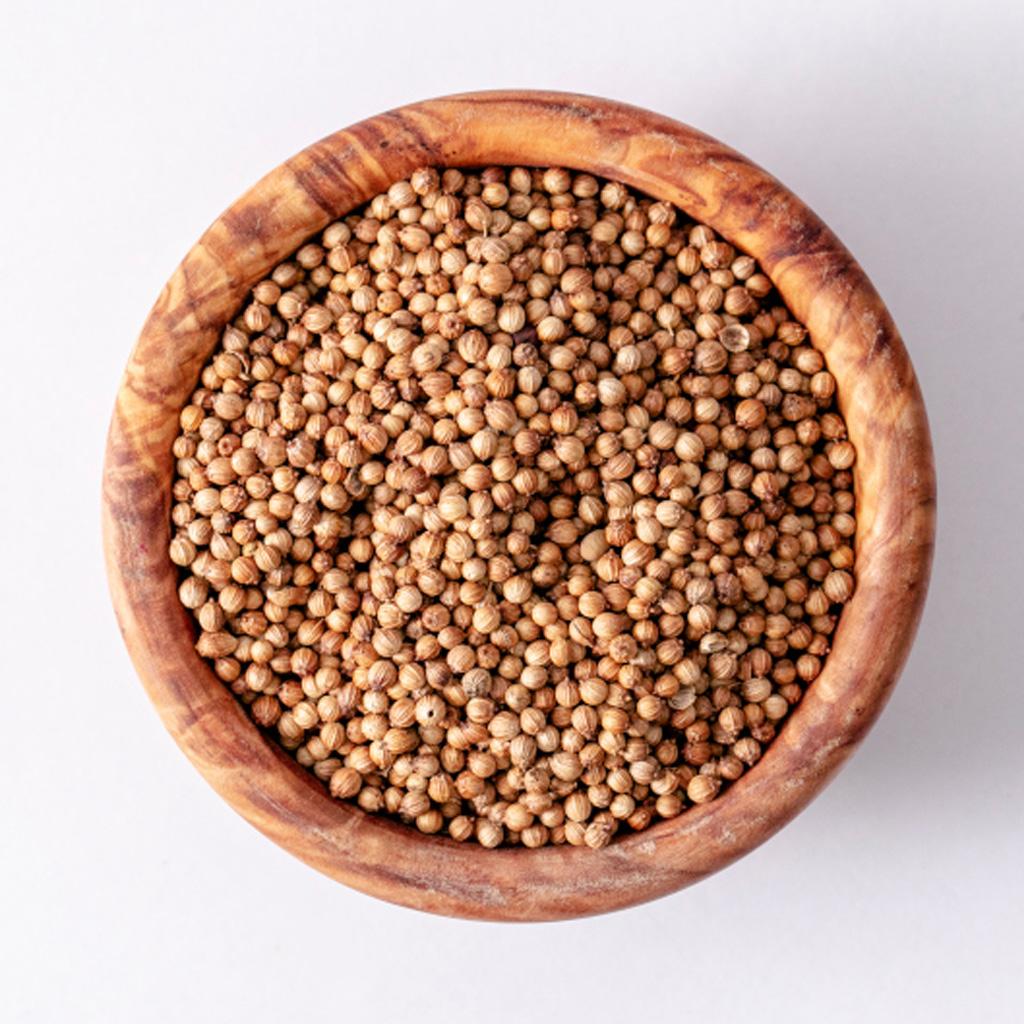 De gehele gedroogde korianderzaden hebben een geel-bruine kleur, zijn bolvormig en hebben een smaak die sterk aan mosterd doet denken. Koriander wordt gevonden in gerechten uit de Indiase, Arabische en Aziatische keuken en wordt vaak gecombineerd met nootmuskaat, venkel, peper, chili, kruidnagels, gember en komijn. Ook in bakkerijproducten wordt het gebruikt, bijvoorbeeld in kruidenmengsels voor zuurdesembroden en kerstgebak.